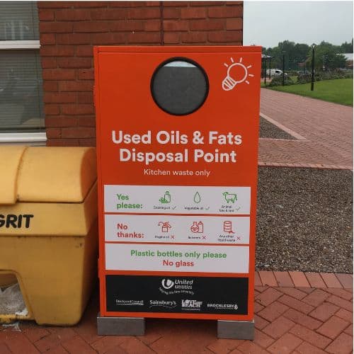 Contenitore per la raccolta dell’olio da cucina usato in acciaio zincato. Fissato al suolo con bulloni; dotato di vaschetta di raccolta per evitare perdite. Spazio per un bidone carrellato da 240 litri a due ruote. Possibilità di personalizzazione con il proprio logo e testo.