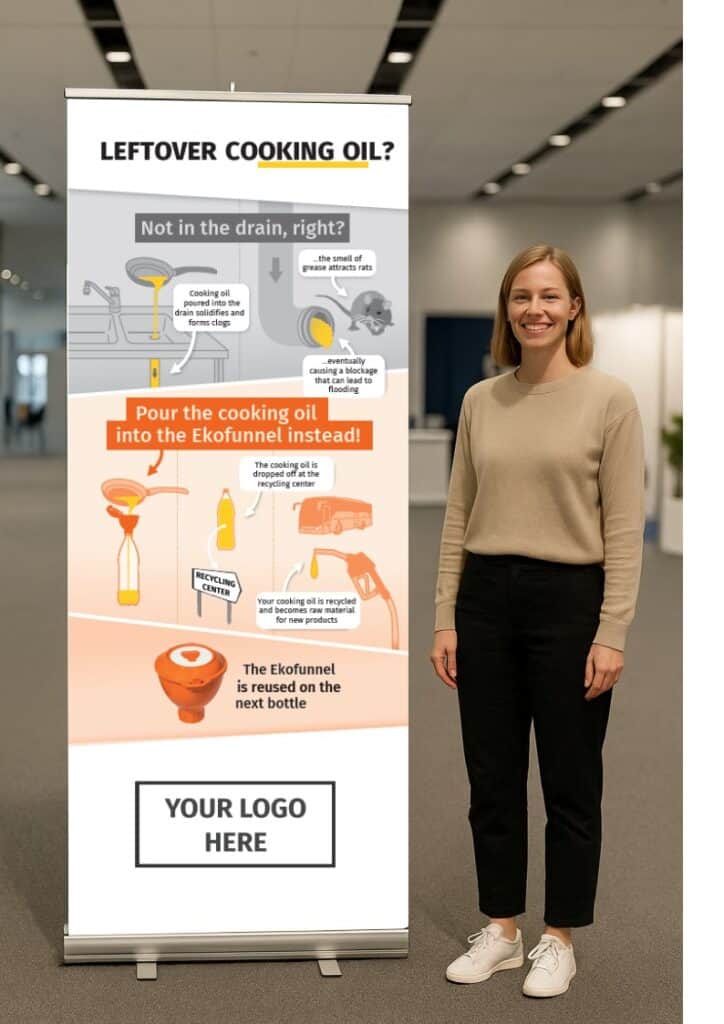 Roll-up con immagini chiare e testo minimo. Può essere utilizzato durante eventi in cui viene distribuito ImbutOlio oppure, ad esempio, presso un banco reception. È possibile personalizzarlo con il proprio logo e con un’immagine specifica del comune relativa alla gestione / raccolta differenziata.